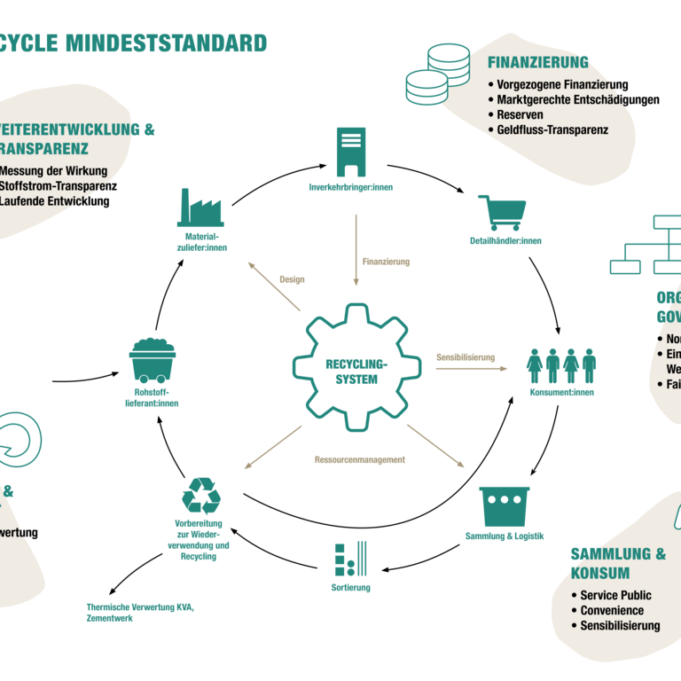 Diese Struktur deckt sich mit den Erkenntnissen des europäischen EPR-Dachverbands für Verpackungen EXPRA1, der nach 30 Jahren Praxis klar benennt, was erfolgreiche Systeme ausmacht, nämlich gemeinnützige Trägerschaft, klare Rollenteilung, Einbindung der ganzen Wertschöpfungskette und effektive Governance, Anreize für ein kreislauffähiges Design, Zielvorgaben, kontinuierliche Wirkungsmessung und hohe Transparenz. Systeme sollen nicht nur sammeln, sondern aktiv die Kreislaufschliessung fördern und gleichzeitig durch Kommunikation und Bildungsarbeit die Bevölkerung sensibilisieren.