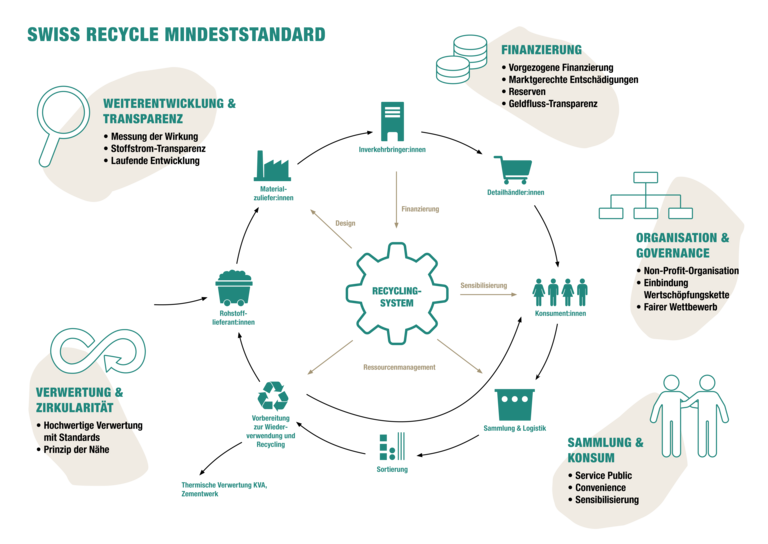 Der Standard, den Swiss Recycle für Recyclingsysteme definiert hat, orientiert sich an fünf Handlungsfeldern: