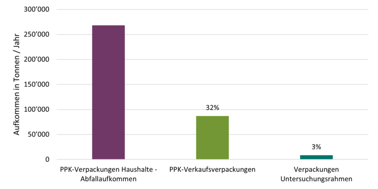 Die Untersuchung zeigt, dass P+K-Lebensmittelleichtverpackungen aktuell mengenmässig nur einen sehr kleinen Anteil am gesamten Schweizer Abfallaufkommen von PPK-Verpackungen in Haushalten ausmachen (3 %, ca. 8'700 t/Jahr, siehe Abbildung 2). Die Datenlage ist jedoch insgesamt lückenhaft, was belastbare Aussagen erschwert.