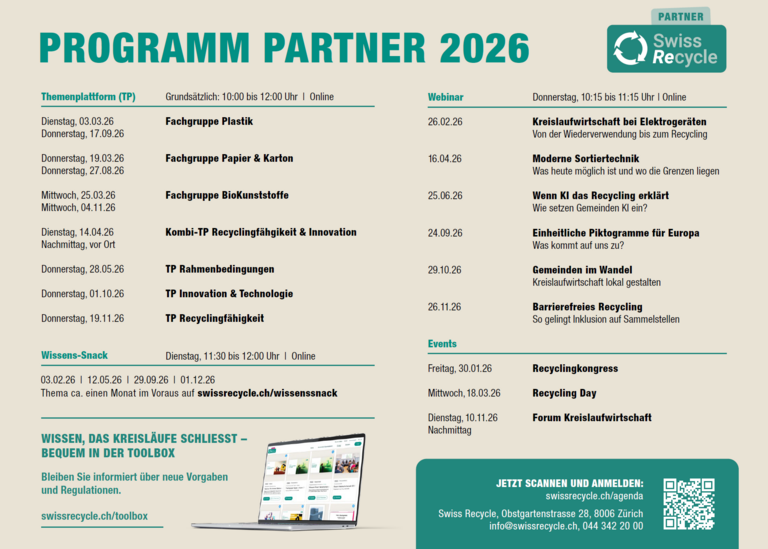 Als Partner von Swiss Recycle können Sie in den nächsten Monaten kostenlos an den folgenden Events und Themenplattformen teilnehmen.