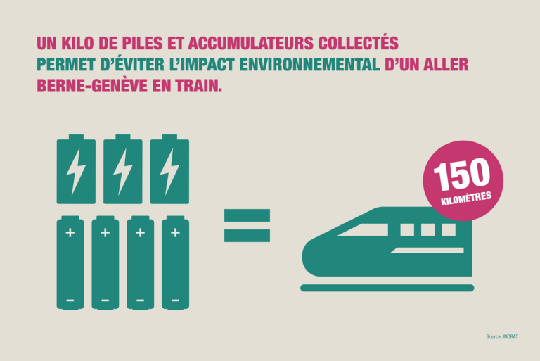 Lorsque la pile arrive en fin de vie, il est important de la mettre au rebut de manière appropriée pour plusieurs raisons: premièrement, cela empêche que les polluants comme le cadmium ne soient rejetés dans l’environnement. Deuxièmement, cela permet de boucler les circuits des matières en récupérant et réutilisant les substances valorisables, comme le zinc (voir à ce sujet le diagramme de flux de matières). Et troisièmement, en éliminant ces déchets de manière appropriée, on réduit au minimum le risque d’un incendie déclenché par les piles au lithium. Tout cela est rendu possible grâce au fait qu’INOBAT prélève la taxe d’élimination anticipée (TEA) lors de la mise en circulation des piles et finance ainsi la collecte, le transport et le recyclage des piles usagées. Environ 11 000 points de collecte (points de vente, déchèteries, centres de collecte, etc.) sont à la disposition des consommateurs et consommatrices pour qu’ils y déposent gratuitement leurs piles usagées.