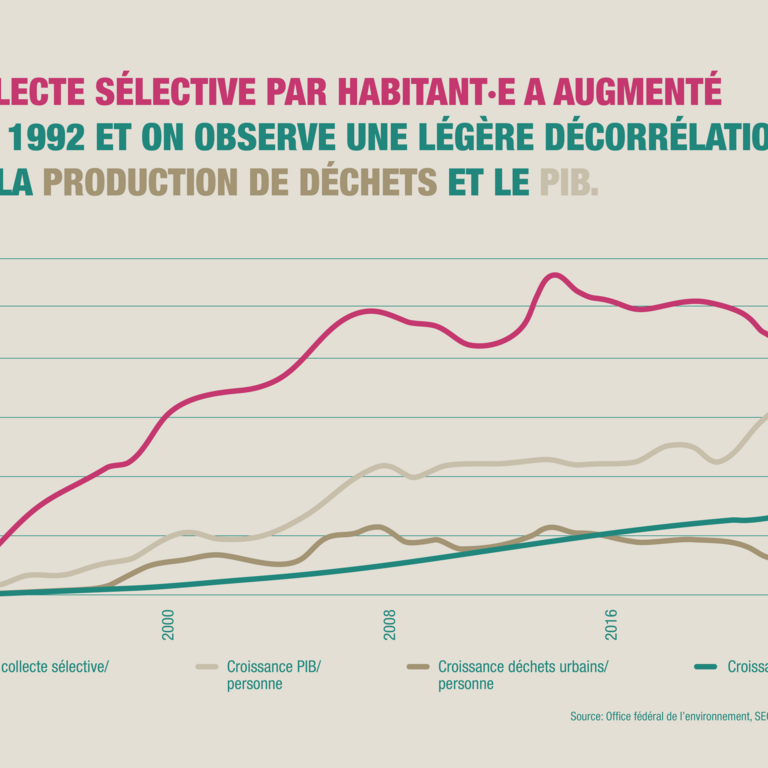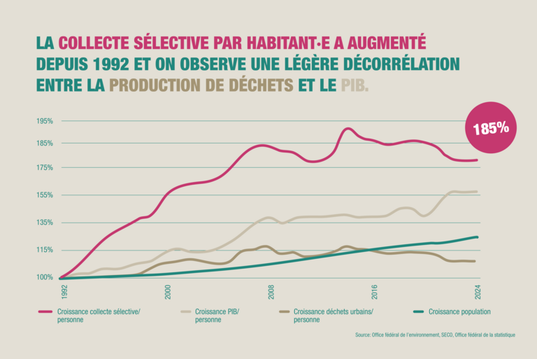 Avec environ 3,1 millions de tonnes de matériaux collectés séparément et presque 2000 milliards d’unités de charge environnementale évitées, en 2024 également, les filières de recyclage existantes auront contribué de manière notable à la protection de l’environnement. Si l’on compare l’évolution sur plusieurs années, on constate que la quantité de déchets urbains par habitant·e stagne légèrement depuis 10 ans, tandis que le PIB continue de croître – une évolution réjouissante, bien que, avec 670 kg/personne, la quantité de déchets par habitant·e et par an reste élevée.