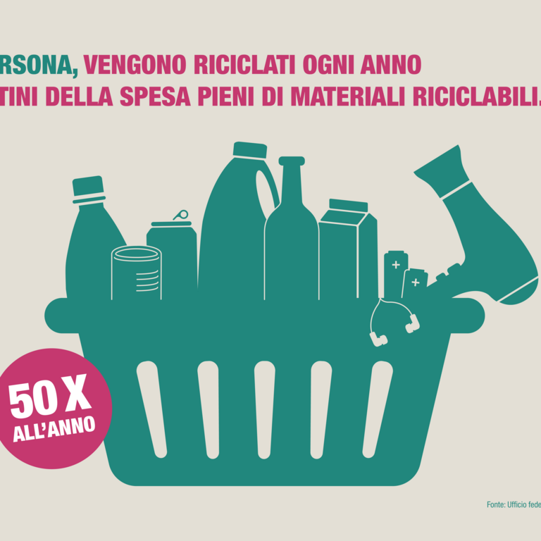 Sulla base del metodo di bilanciamento ecologico, è stato possibile per gli/le esperti/e di Carbotech determinare un significativo beneficio ecologico dei sistemi di riciclaggio svizzeri. Ogni cittadino(a) svizzero(a)raccoglie un totale di 50 cestini della spesa ricolmi all’anno, così 3,1 milioni di tonnellate di materiale ritornano nel ciclo.