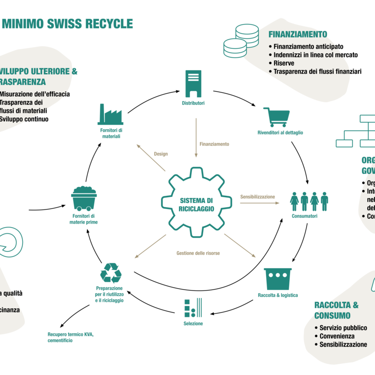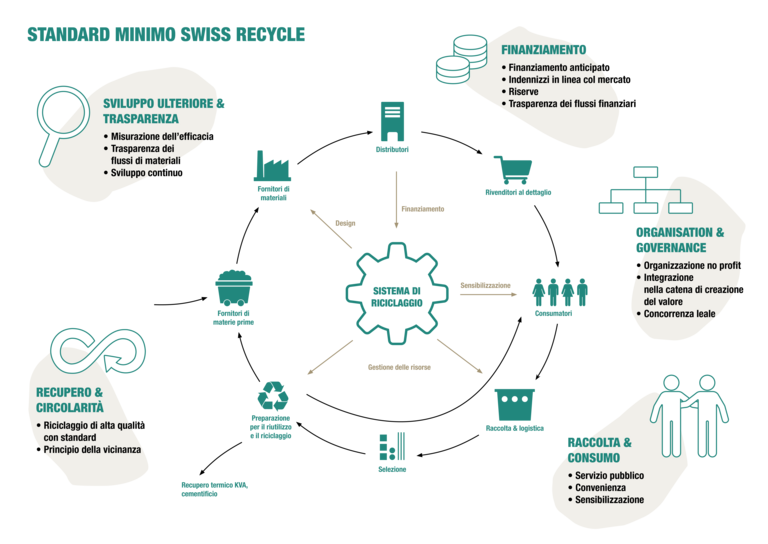 Lo standard definito da Swiss Recycle per i sistemi di riciclaggio si orienta a cinque ambiti d’intervento: