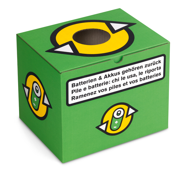Eine Sammelbox, in der die alten Batterien aufbewahrt und zur Sammelstelle transportiert werden können. Die Sammelbox von Inobat ist robust genug, um mehrmals verwendet werden zu können.