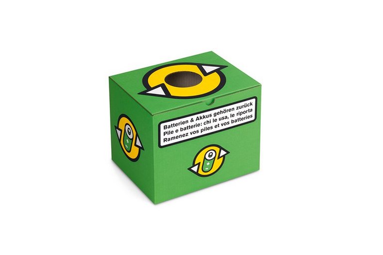 Eine Sammelbox, in der die alten Batterien aufbewahrt und zur Sammelstelle transportiert werden können. Die Sammelbox von Inobat ist robust genug, um mehrmals verwendet werden zu können.